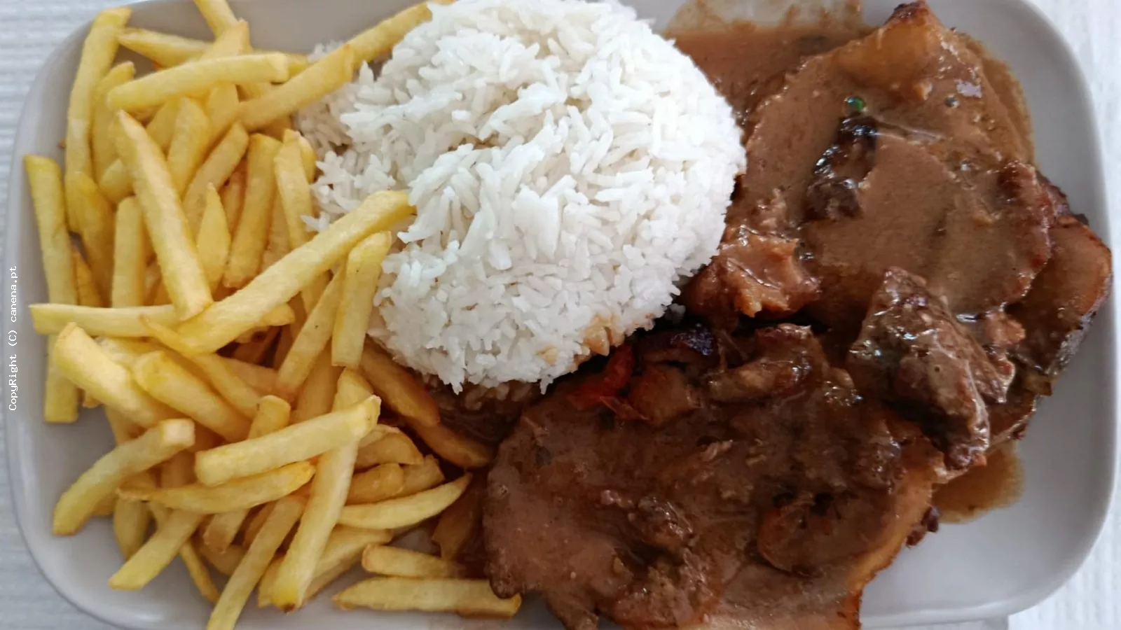 O Cachaço Recheado é servido com batata frita temperada com especiarias, arroz branco soltinho e uma salada fresca de alface e tomate. Estes acompanhamentos equilibram os sabores intensos da carne e do recheio, oferecendo uma refeição completa e harmoniosa.