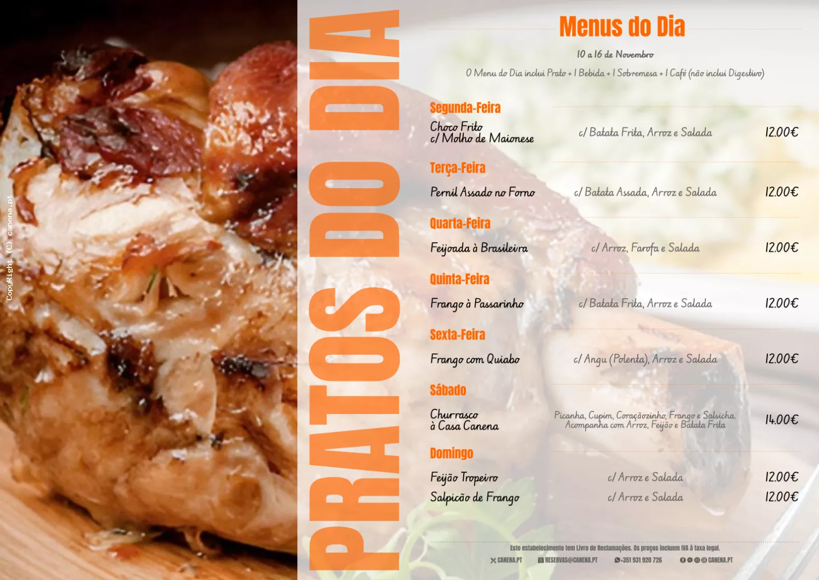 - Churrasco à Casa Canena: Picanha, Cupim, Coraçãozinho, Frango e Salsicha. Acompanha com Arroz, Feijão e Batata frita - 14.00€