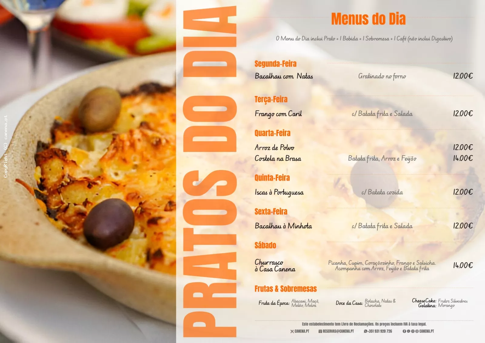- Churrasco à Casa Canena: Picanha, Cupim, Coraçãozinho, Frango e Salsicha. Acompanha com Arroz, Feijão e Batata frita - 14.00€