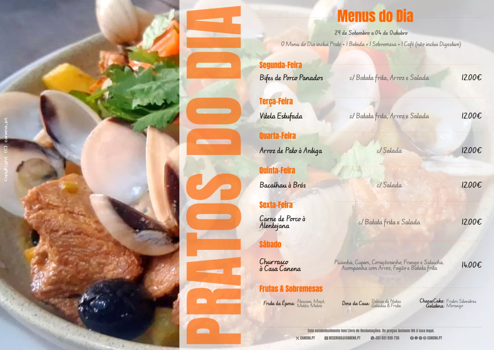 - Churrasco à Casa Canena: Picanha, Cupim, Coraçãozinho, Frango e Salsicha. Acompanha com Arroz, Feijão e Batata frita - 14.00€